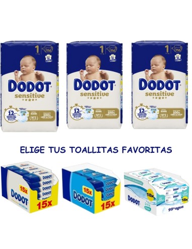 Pack de Pañales Dodot Sensitive Talla 1 - 348 Unidades y Toallitas