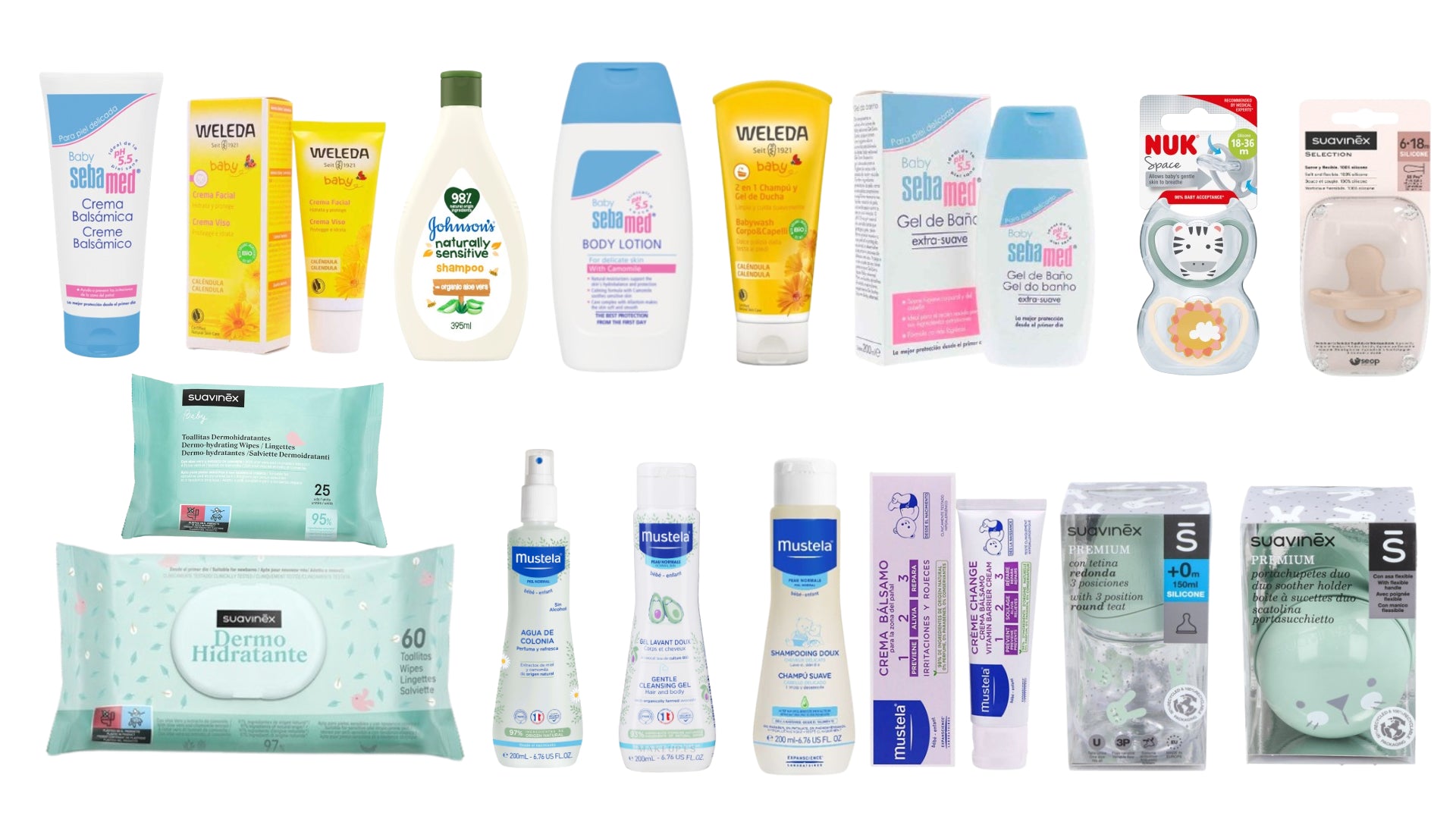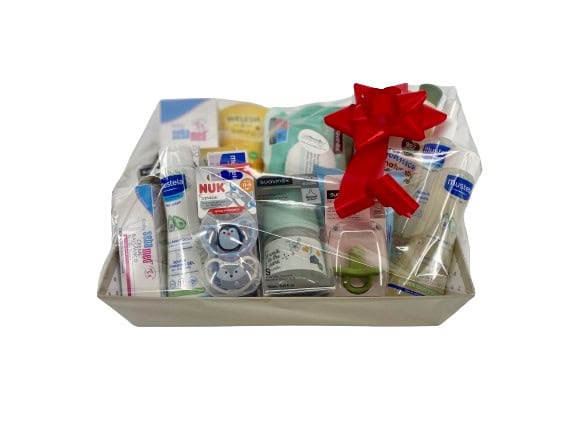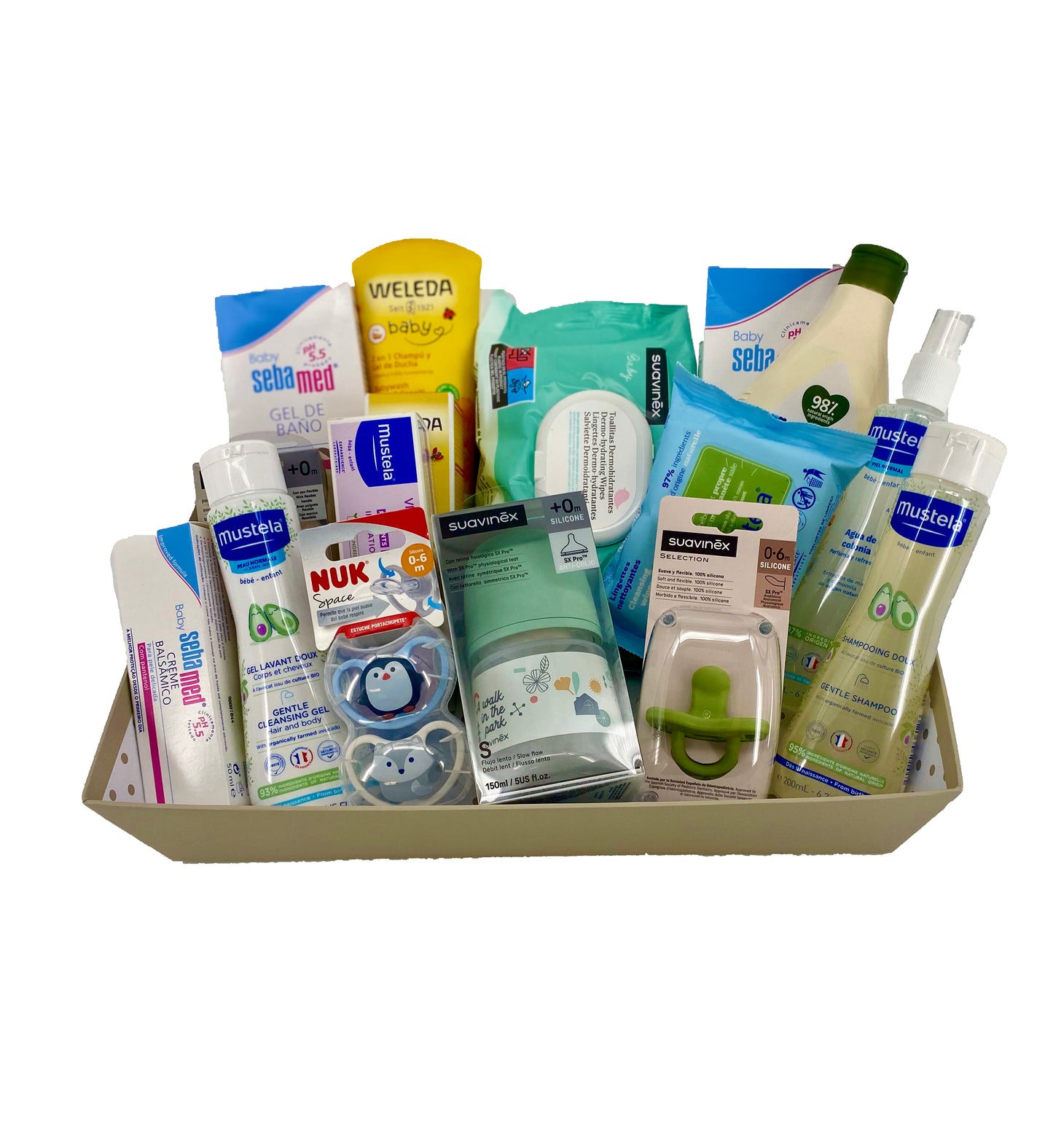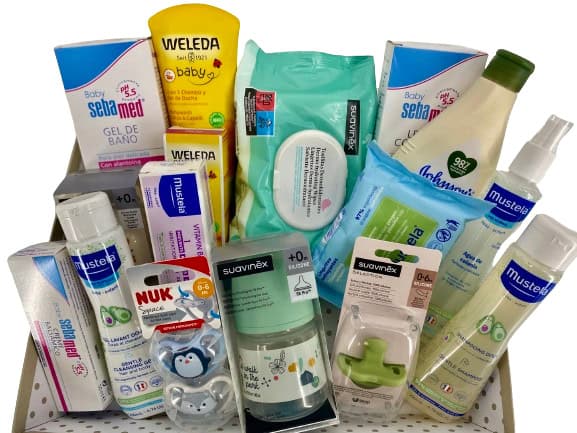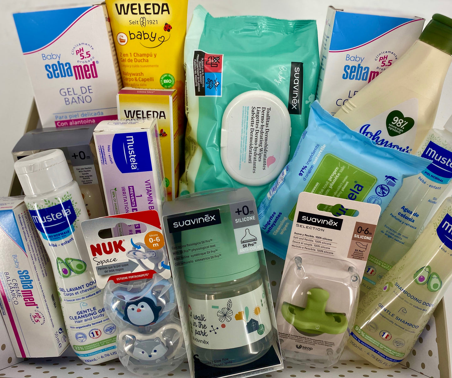 Una cesta muy completa y variada que contiene productos de las mejores marcas para bebés recién nacidos como es SUAVINEX , MUSTELA, WELEDA ,SEBAMED, JOHNSONS BABY, NUK