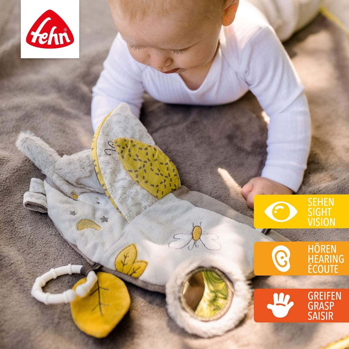 Compañeros de juego adorables: el bonito koala y el esponjoso oso hormiguero de la colección Australia te invitan a descubrir, explorar y sentir. Los chirridos, los cascabeles, el crujido del papel y el pequeño espejo asombran el rostro del bebé y favorecen los primeros ejercicios de agarre, el sentido del tacto y contribuyen al desarrollo positivo de la percepción del ego.