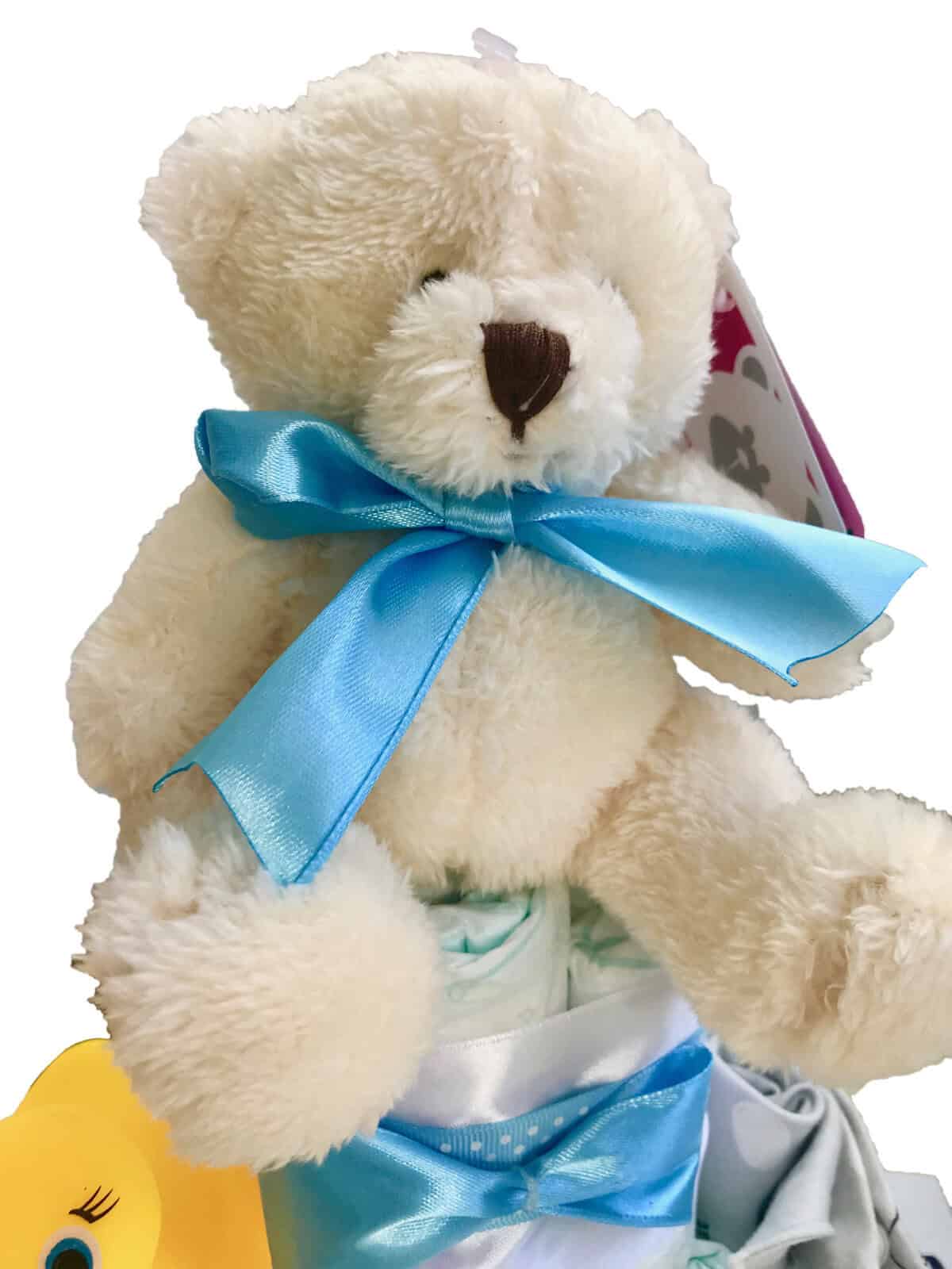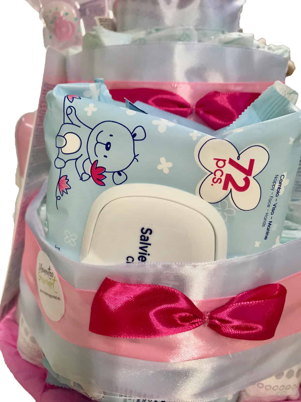 La tarta de pañales se realiza en una presentación para regalo en papel celofán y lacito a juego
