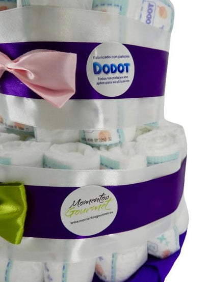 Nuestras tartas de pañales están elaboradas con pañales de la marca Chelino garantizando la mejor calidad y absorción para el bebé.