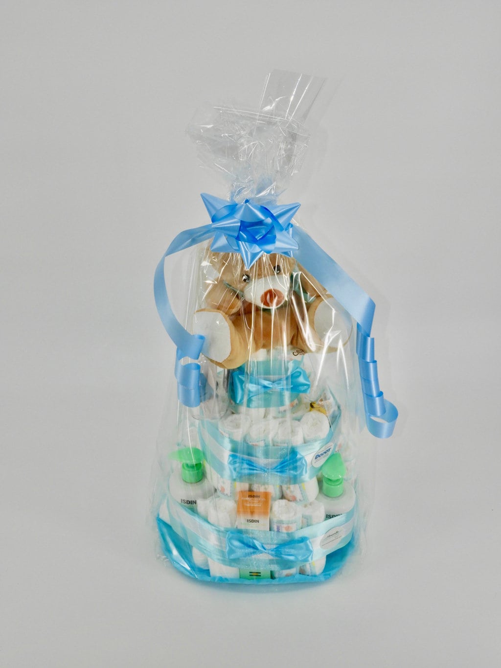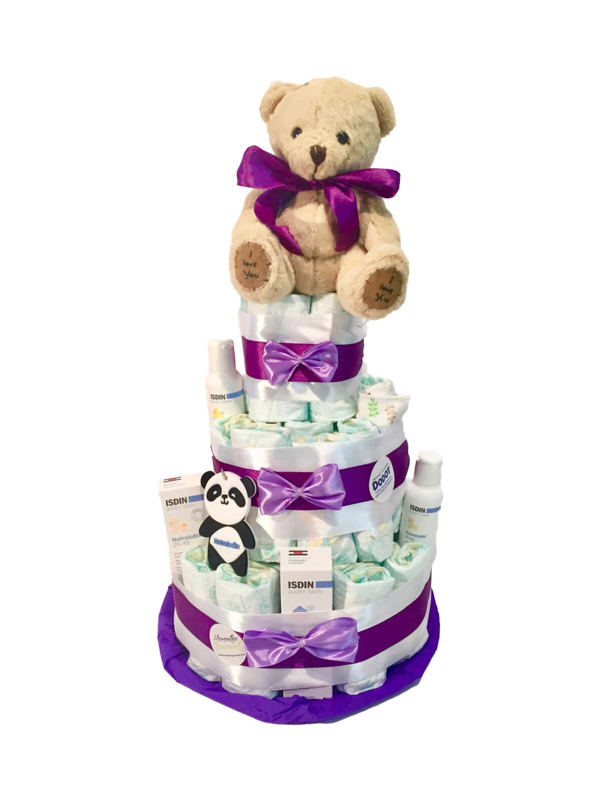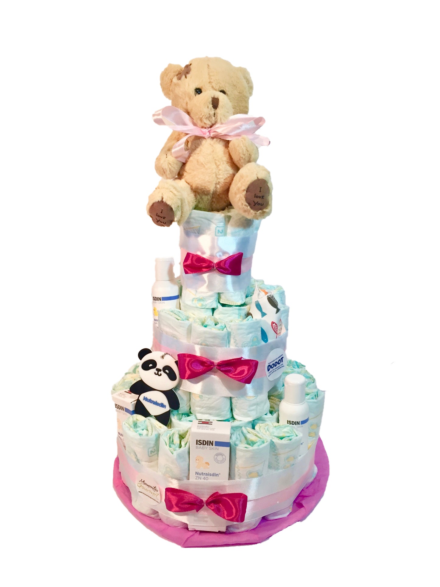 Los padres se sorprenderán al recibir una tarta pañales de tres pisos y de 50 unidades, muy bien decorada, acompañada por productos Nustraisdin y envuelta por papel celofán de forma tan cuidadosa.