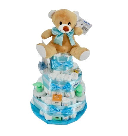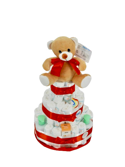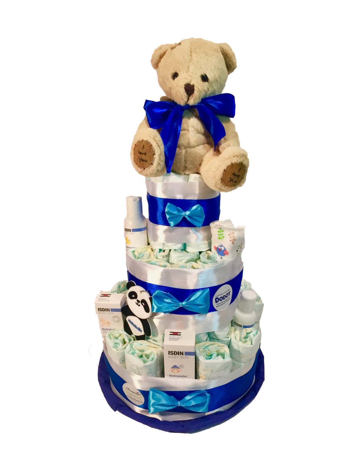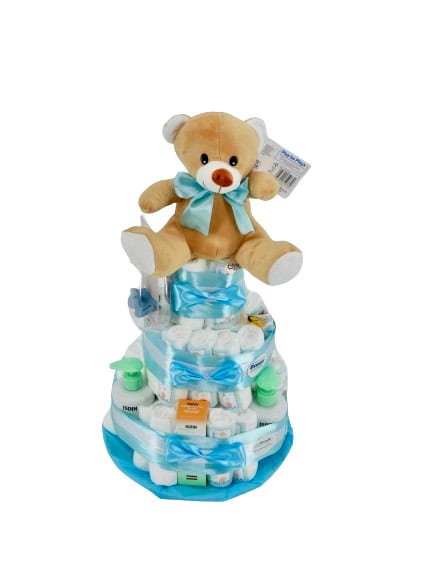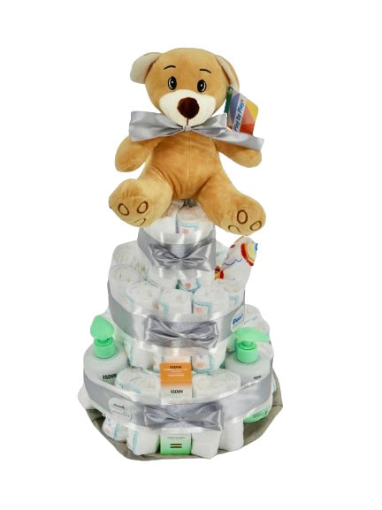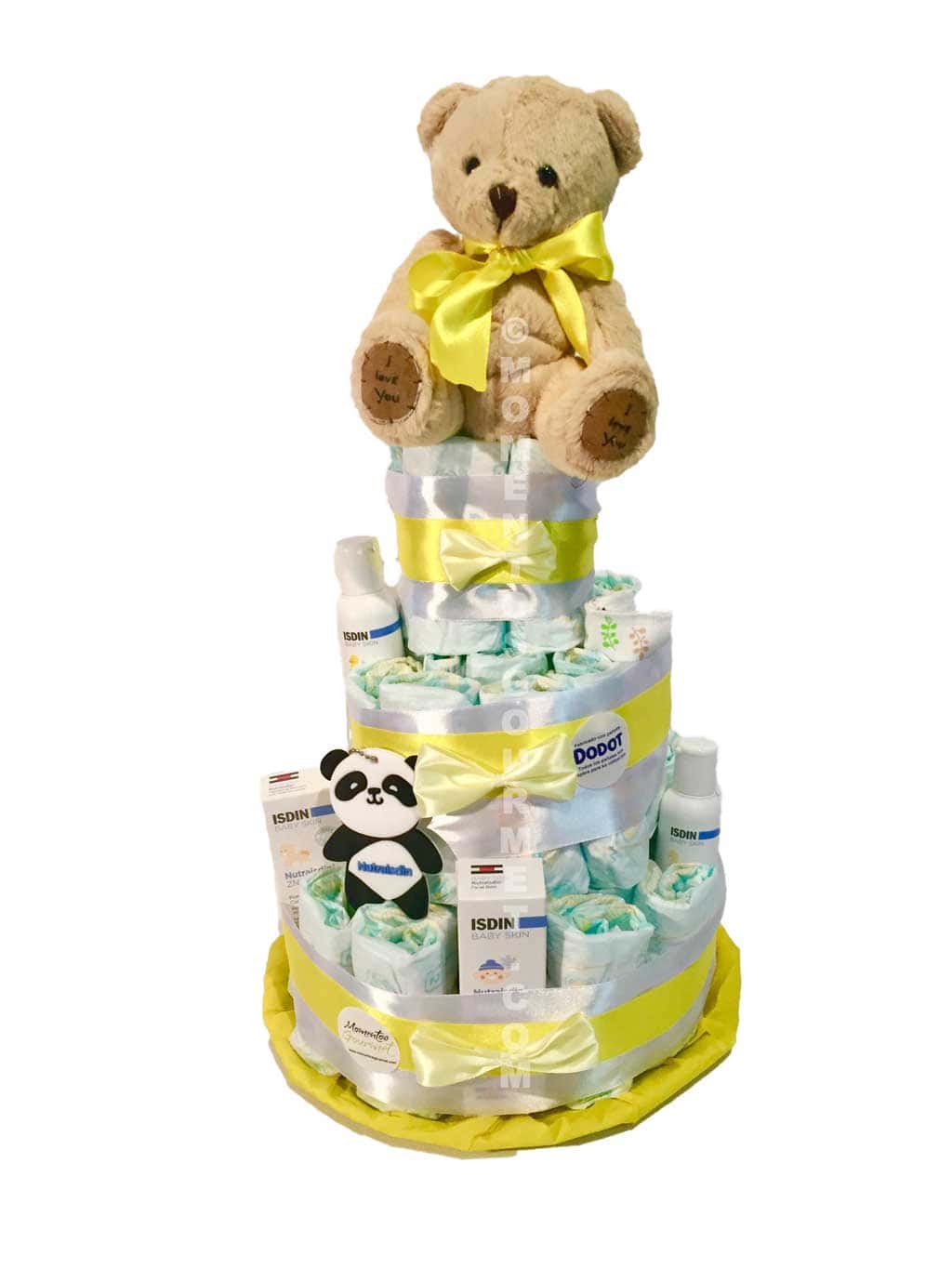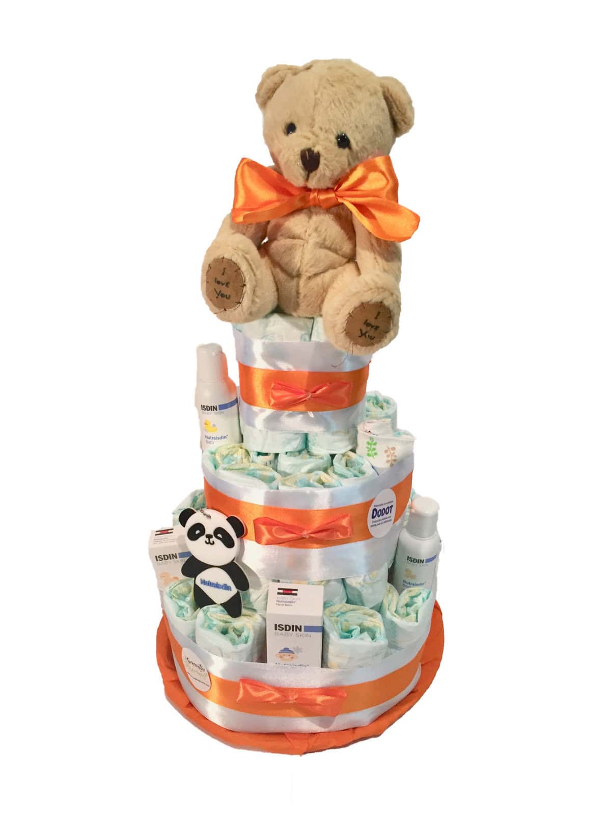 Los padres se sorprenderán al recibir una tarta pañales de tres pisos y de 50 unidades, muy bien decorada, acompañada por productos Nustraisdin y envuelta por papel celofán de forma tan cuidadosa.